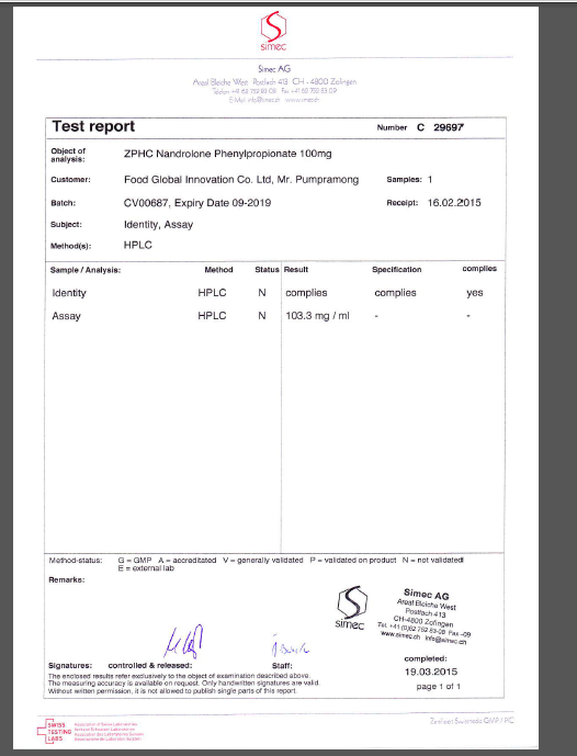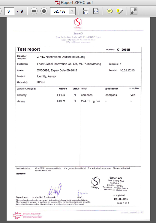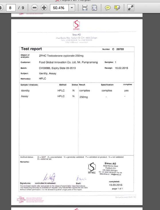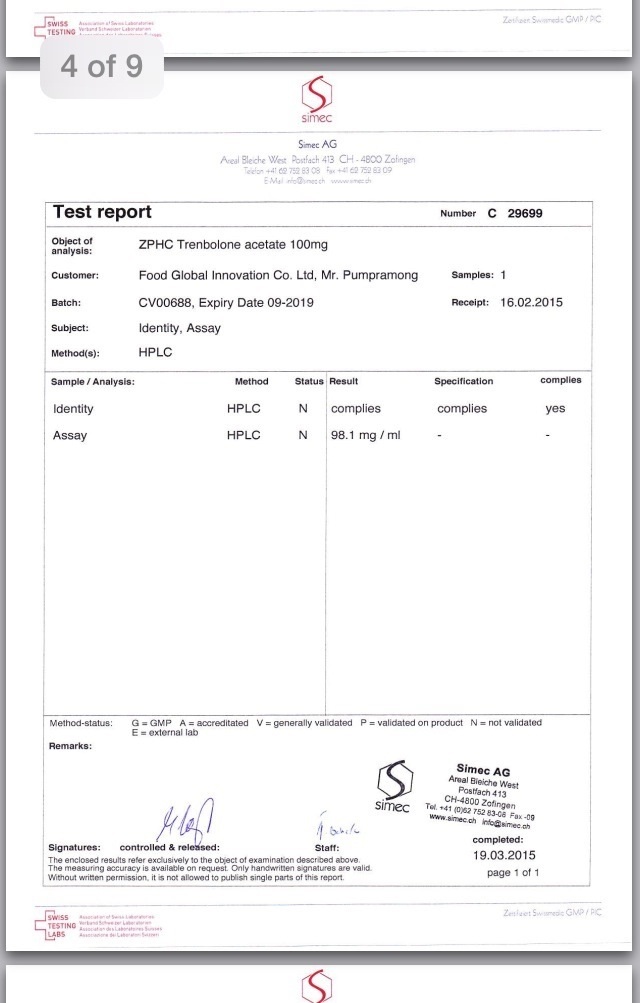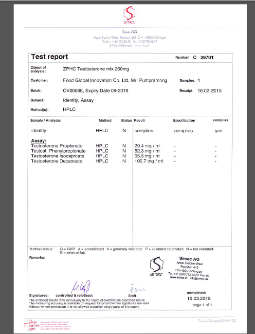1. ампула ZPHC тренболона ацетата содержит - 113.7 мг чистого тренболона ацетата 2. ампула ZPHC Boldenone undecylenate содержит - 314.8 мг чистого Boldenone Undecylenate 3. ампула ZPHC Nandrolone Decanoate содержит - 298.6 мг чистого Nandrolone Decanoate 4. ампула ZPHC Nandrolone Phenylpropionate содержит - 116.8 мг чистого Nandrolone Phenylpropionate 5. ампула ZPHC Testosterone Cypionate содержит - 282.4 мг чистого Testosterone Cypionate 6. ампула ZPHC Тестостерона энантата содержит - 284.7 мг чистого Testosterone enanthate содержание кажого вещества определено в сравнении с эталоном и не содержит других примесей в самих веществах. то есть используя препараты http://www.zphc.hk вы можете с уверенностью опираться на данные выводы Швейцарской лаборатории Simec AG http://www.simec.ch/en/ -------------------- ZPHC