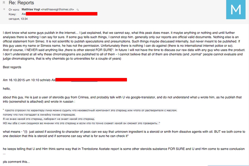 И, конечно, я никогда не говорил ничего подобного "есть другой стероид точно". В будущем я не буду иметь время, чтобы обсудить наши исходные данные с любым парнем, который использует продукт. Я не понимаю вообще, почему эти хроматограммы публикуются. Я не могу поверить, что все из них химики (и "обычные" люди не могут оценить и судить хроматограммы, надо учится на химическом в университете в течение нескольких лет ) С наилучшими пожеланиями