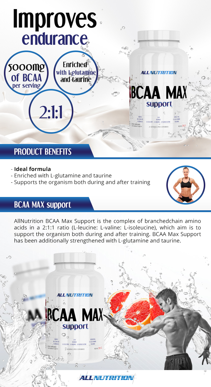 Как упоминалось ранее, в условиях дефицита энергии, организм может использовать ВСАА как источник топлива. Отсюда следует, что употребление BCAA Max Support от Allnutrition помогает повысить энергетические резервы организма и снизить усталость. При силовых тренировках, это качество аминокислот ВСАА крайне важно для подавления катаболизма и защиты мышечных клеток от разрушения.