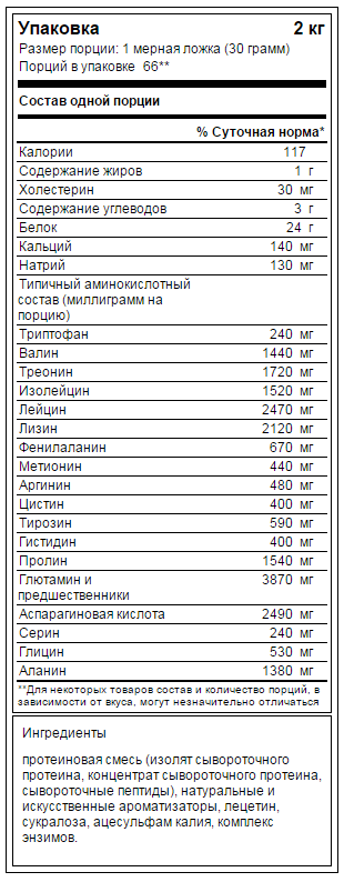 Ультра протеин - 80 сывороточный - не содержит практически жиров, углеводов (лактозы). Благодаря микро и ультра фильтрация препарат отделен от ненужных балластных веществ. Данный протеин содержит большое количество аминокислот, которые также необходимы для роста мышц.