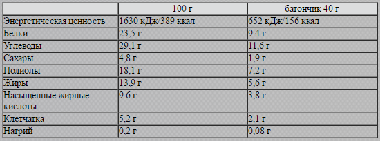 Ледяной кофе: мальтитный сироп, молочная глазурь (мальтит, гидрогенезированный растительный жир, какао, молоко, сыворотка, эмульгатор соевый лецитин и E 476, ароматизатор), изолят соевого белка, изолят молочного белка, загуститель полидекстроза, не гидрогенезированный растительный жир, гидролизат желатина, гигроскопичный глицерин, инулин, желатинизированный кукурузный крахмал, соевые хлопья, сливки с лесным орехом (сахар, растительный жир, растительное масло, сыворотка, какао, ореховая паста, эмульгатор соевый лецитин, ароматизатор), кукурузный крахмал Hi-Maize, рисово-картофельный экструдат (рис, картофель-пюре, сахар, пшеничная клетчатка, свёкла обыкновенная), эмульгатор рапсовый лецитин, ароматизатор, краситель карамель, консервант сорбиновая кислота.