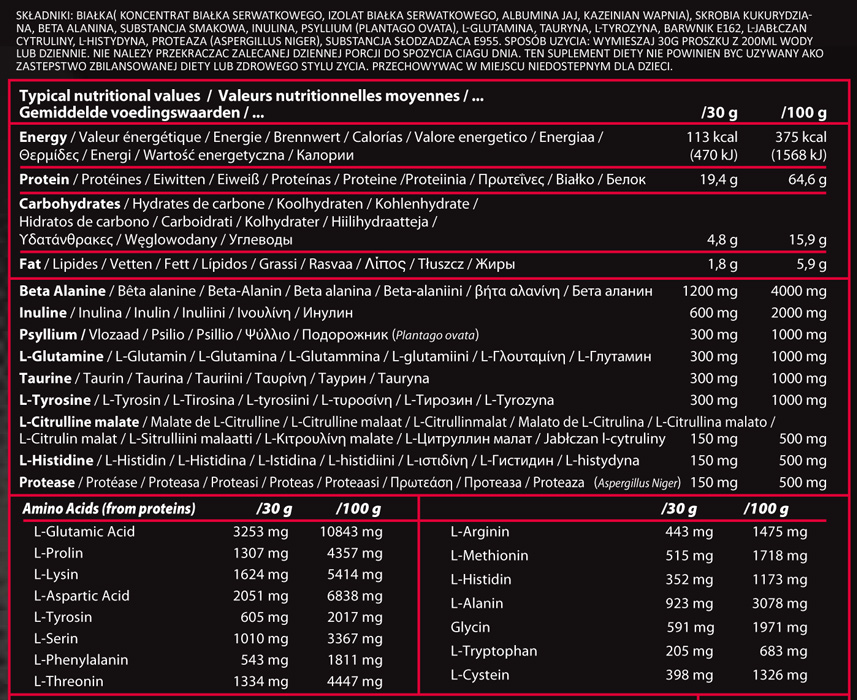 Ингридиенты: белки (концентрат сывороточного протеина, изолят сывороточного протеина, яичный альбумин, казеинат кальция), кукурузный крахмал, бета-аланин, Avour, (Plantago Ovata), L-глютамин, таурин, L-тирозин, E162, L-цитруллин малат, L-гистидин, протеазы, подсластитель E955