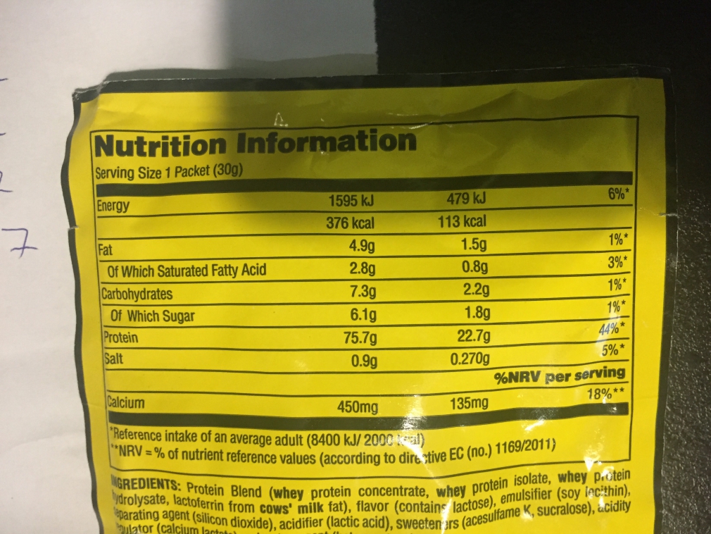 Ингредиенты: ультрафильтрованный концентрат сыворотки, сывороточные изоляты, частично гидролизованные сывороточные пептиды и глютаминовые пептиды, натуральные и искусственные ароматизаторы, сукралоза, ацесульфам калия.