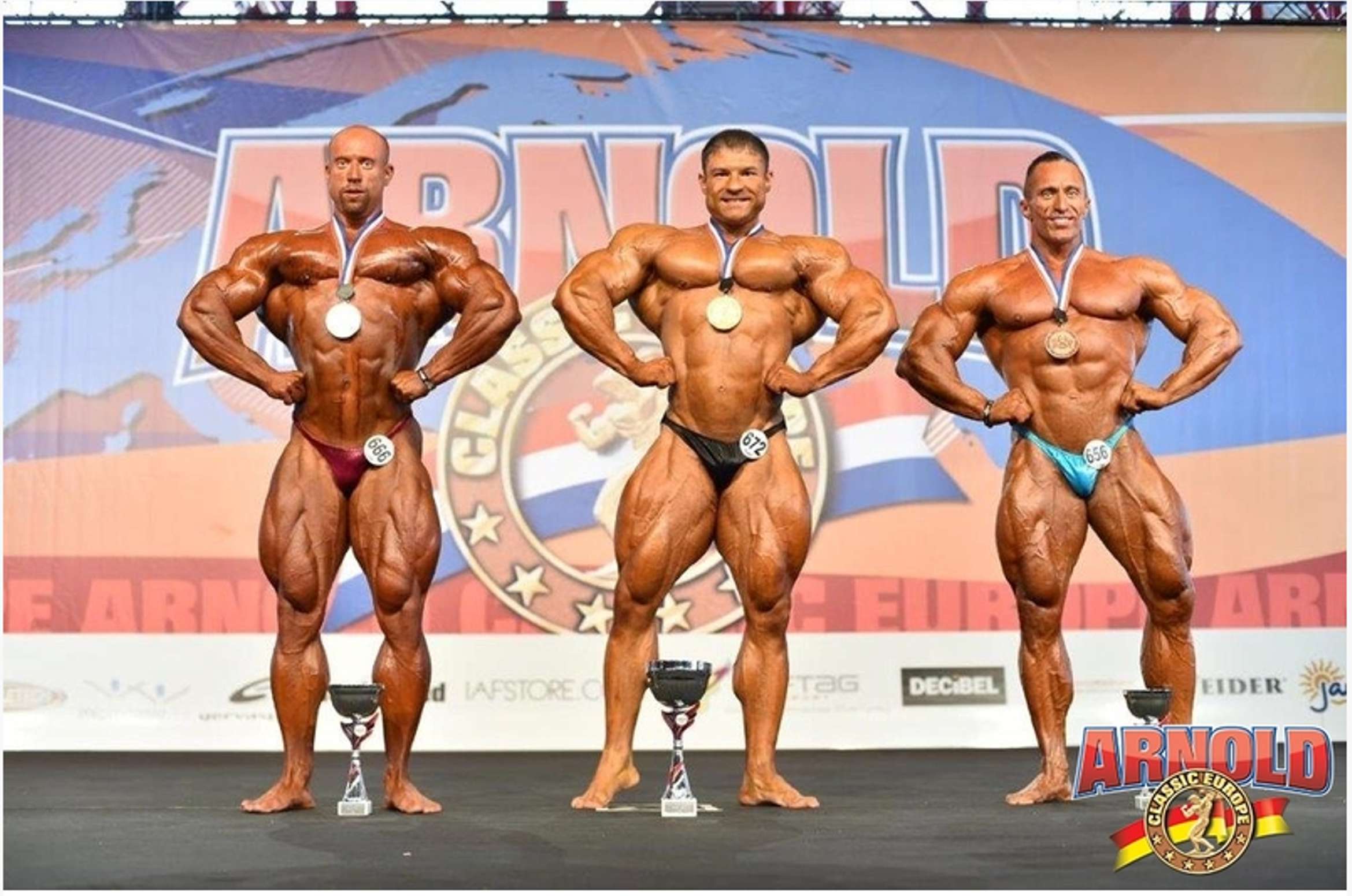 Этот год очень успешный для испанского культуриста Антонио Гутьерреса (Antonio Gutierrez). После победы на Чемпионате Европы 2014 (абсолютный победитель среди ветеранов!). Он занял первое место на Любительской Олимпии Латинская Америка и теперь повторил этот результат на Арнольд Европа, выиграв все три раунда в подкатегории до 90 кг. В борьбе за другие призовые места произошло нечто невероятное! Три спортсмена: Эдсон Серафим (Edson Serafim), Бразилия, Мохаммад Пашайи (Mohammad Pashayi), Азербайджан, и Джованни Кубедду (Giovanni Cubeddu),Франция, к концу второго тура набрали одинаковое количество очков – по 30. Третий раунд (позирование) внес некоторые отличия буквально в одно очко между ними, и Серафим второй раз подряд оказался на втором месте.