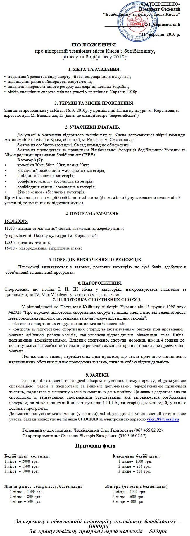 Положение об открытом чемпионате города Киева по бодибилдингу, фитнесу и бодифитнесу 2010г: