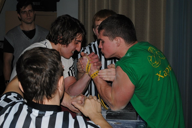 Например, в весовой 65 кг у девушек победа спортсменки третьего разряда Лины Деменко из Кобеляк над КМС из Харькова Арзу Гасановой в затяжном поединке на левую руку, который длился около 2 минут. Победа Максима Меркулова из Сум над одноклубником, неоднократным призером чемпионатов мира и Европы Евгением Литовцевым на левую и правую руку в силовой напряженной борьбе. Второе место на левую в весовой 65 кг у юноши Вадима Халявы и его победы над чемпионами и призерами областных и всеукраинских соревнований среди взрослых.